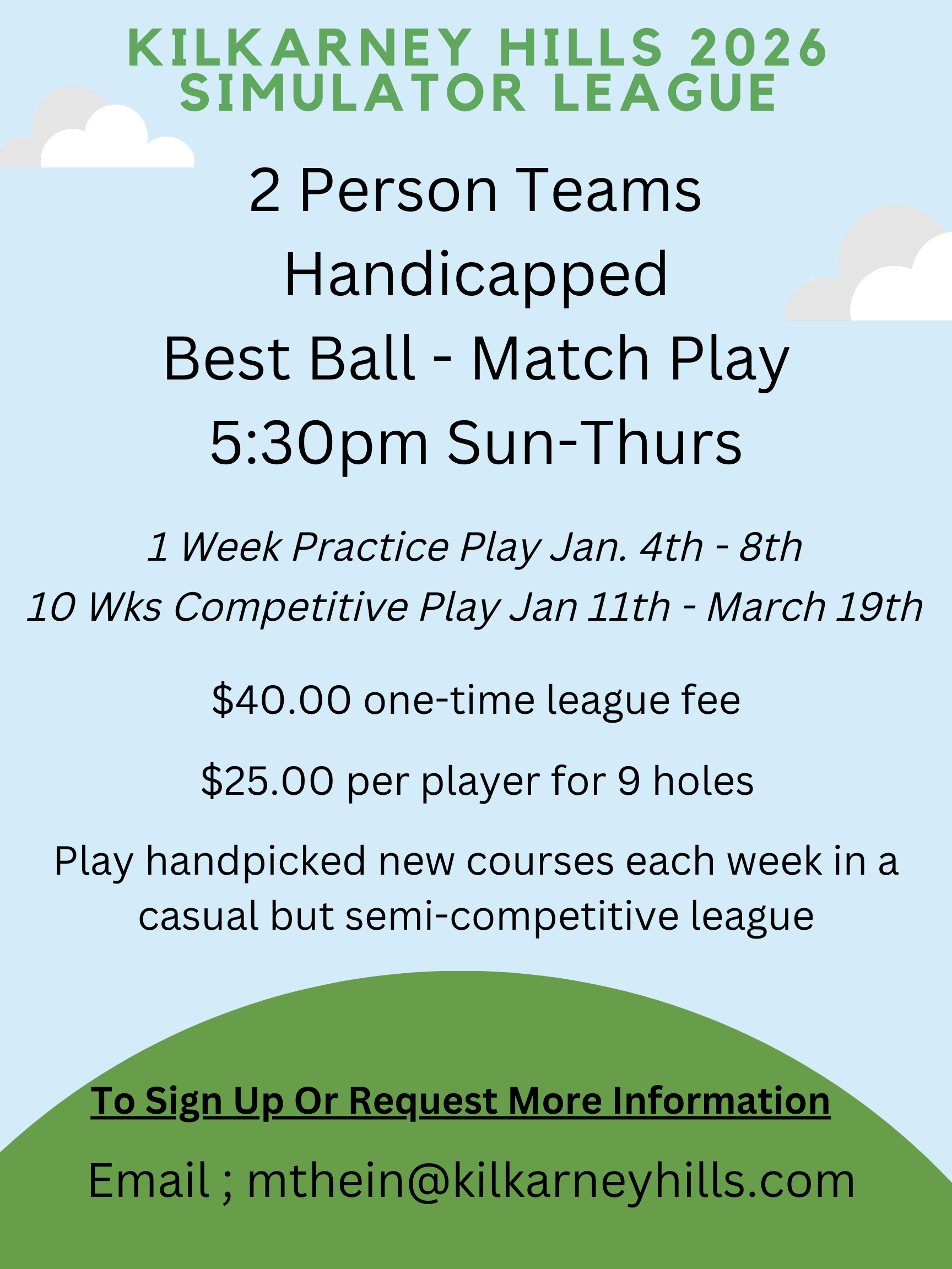 Simulator League: Plays January 4th, 2026 through March 19th. 2 person teams, handicapped best ball/match play. 5:30pm on weeknights and Sunday's. Please email Mason, at mthein@kilkarneyhills.com for more information! League Flyer Here!